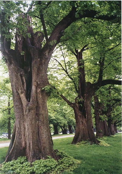 De indrukwekkende, eeuwenoude bomenlaan aan de voorzijde van de abdij [enorme kastanjes...].