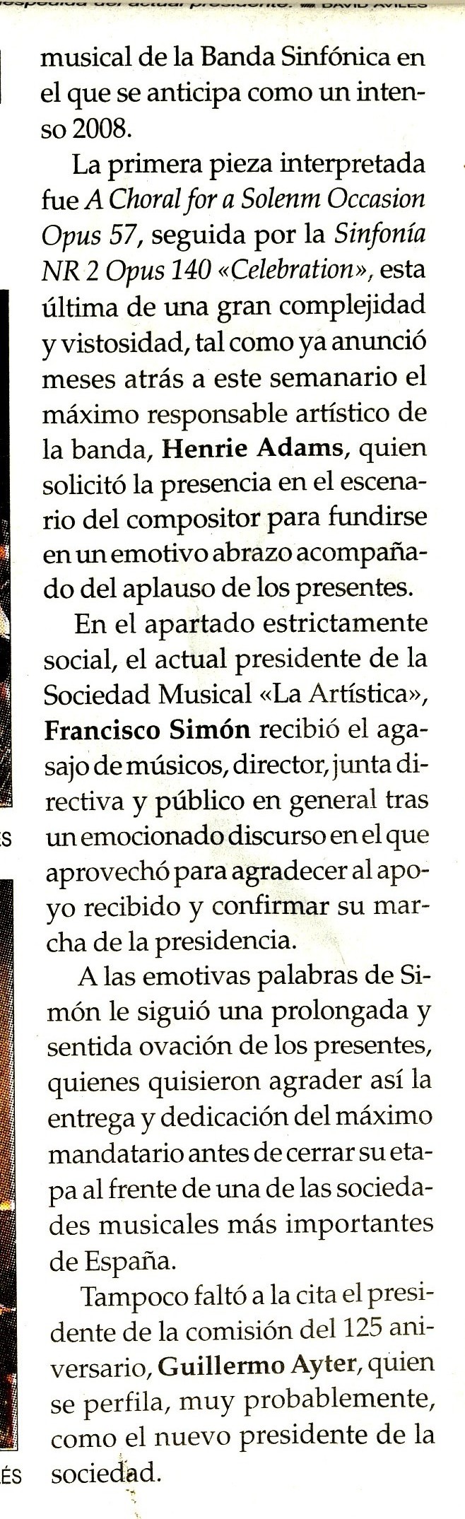 De president van de muzikale gemeenschap ‘La Artistica’, Francisco Simon ontving het onthaal van de muzikanten, directeur, het bestuur en het publiek als gevolg van een emotionele toespraak waarin hij gebruik heeft gemaakt van de gelegenheid om iedereen te danken voor de steun en om zijn vertrek van het presidentschap aan te geven, die gevolgd werd door een ovatie van de aanwezigen die zo hun erkentelijkheid wilden tonen voordat hij zou vertrekken van een de belangrijkste muzikale gemeenschappen van Spanje.